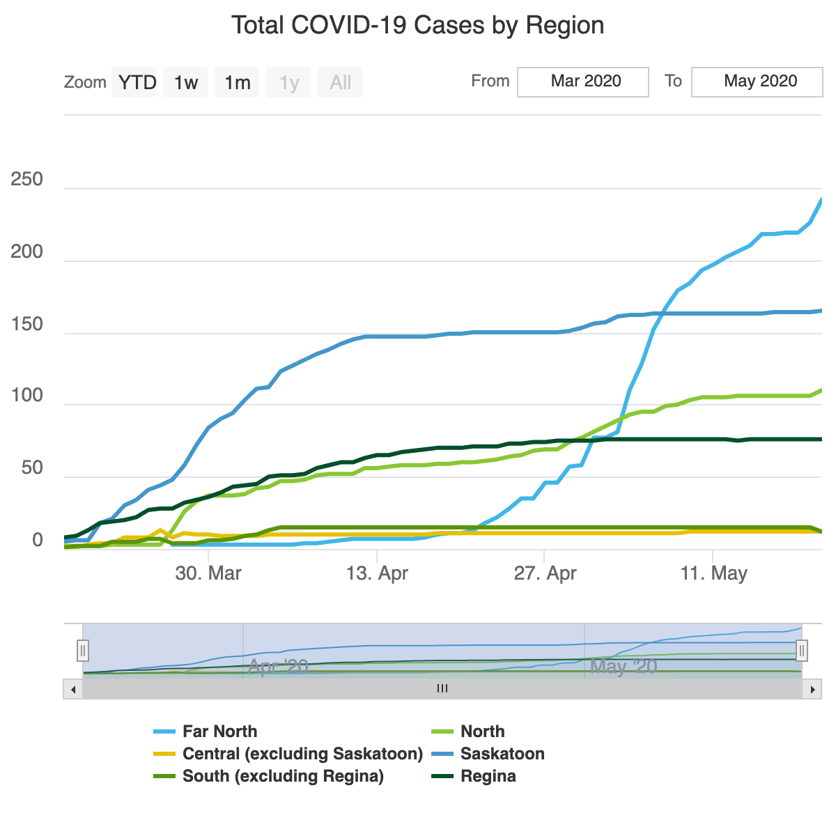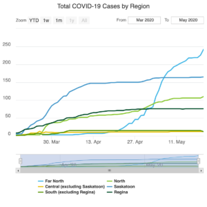 As of May 20, 2020, Saskatchewan has 21 new, confirmed cases of COVID-19, bringing the provincial total to 620.  Sixteen of the cases are in the Far North (including nine in La Loche and six in Beauval), four in the North and one in the Saskatoon area.